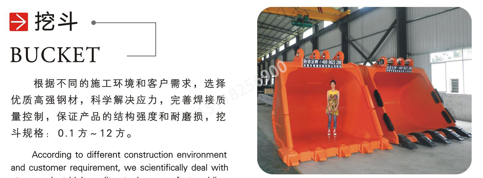产品特点:挖斗的齿座板和侧刃板材料可以根据土方或挖掘混有较硬碎石的硬土、次坚石、风化石或坚石、爆破后的矿石的装载作业环境选用Q355、NM460或瑞典进口的超高强度耐磨钢HARDOX。
