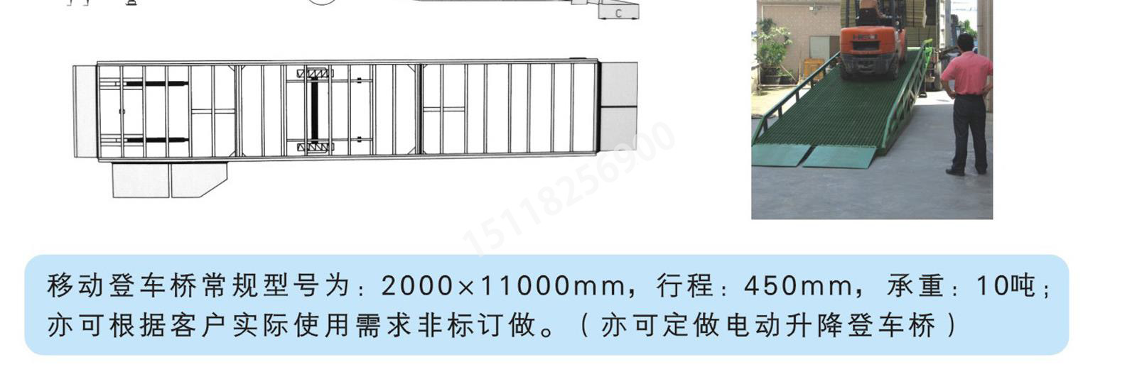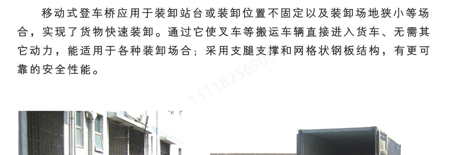 产品特点:移动登车桥也叫货柜车装卸平台或登车桥,主要用于没有货台的场地装卸货作业。移动式登车桥斜坡部分采用格栅板,不但防滑性能好,而且不容易藏垃圾,能保证长期使用不变形